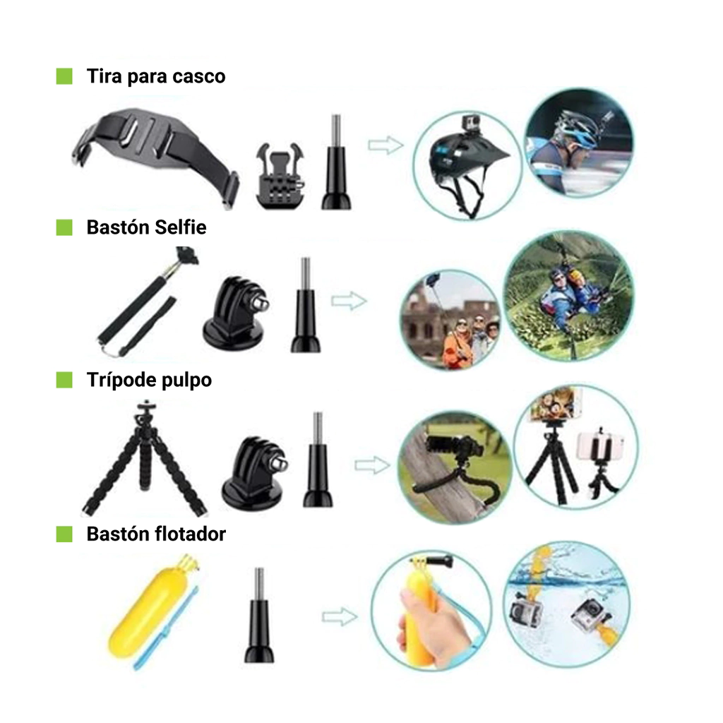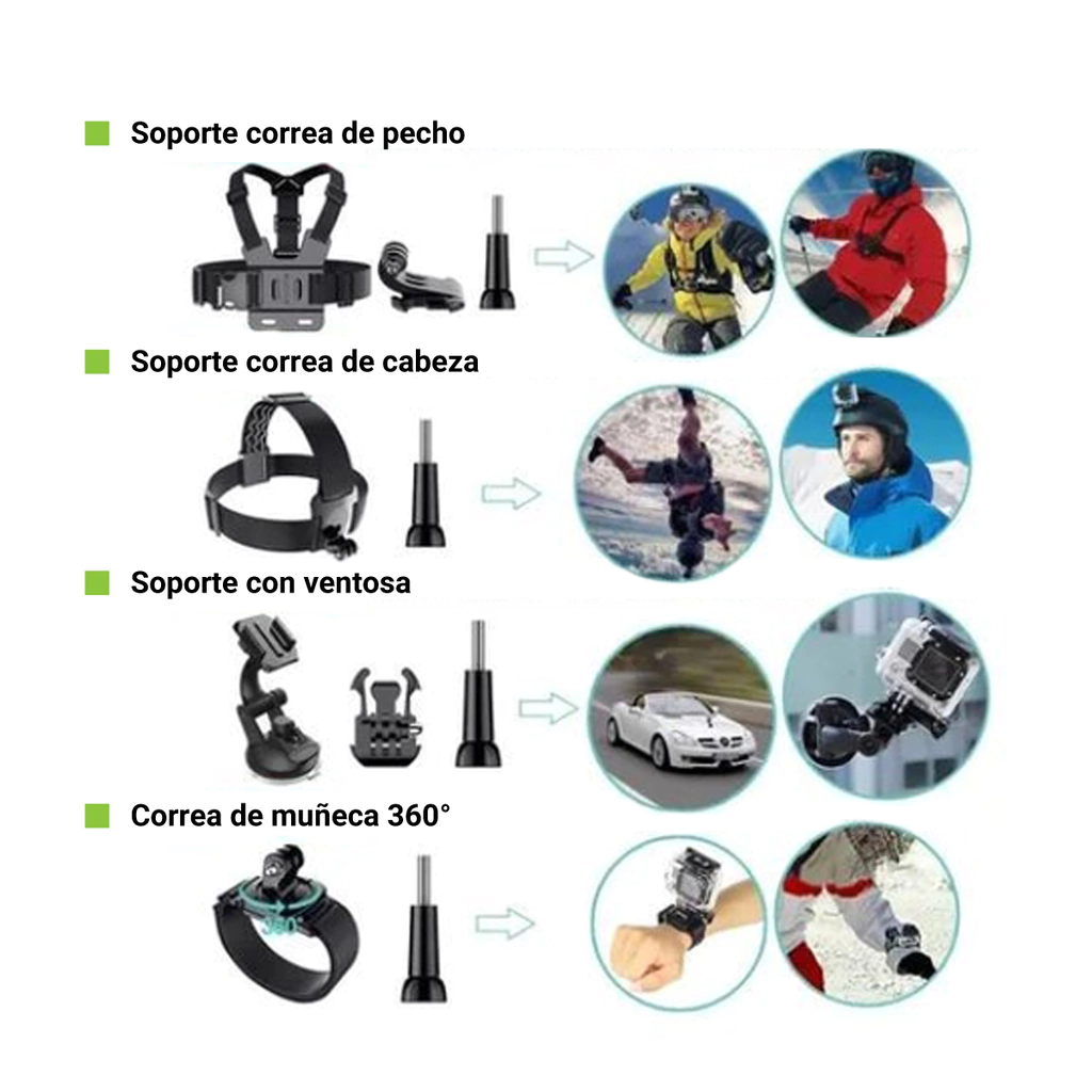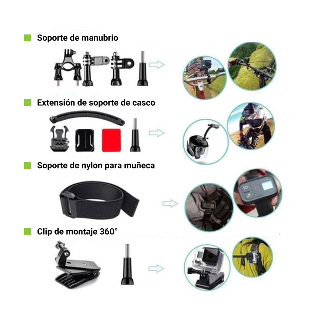 En una compra todos los accesorios que podés llegar a necesitar para cualquier tipo de deporte que practiques con tu cámara de acción. Incluye un estuche para que puedas llevar todo de forma cómoda incluida la cámara, sin perder un solo accesorio. También sirve para las cámaras alternativas.