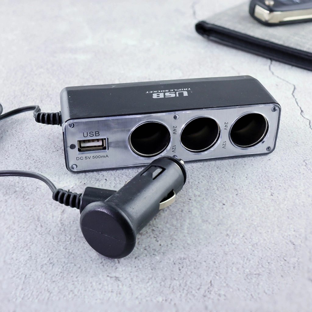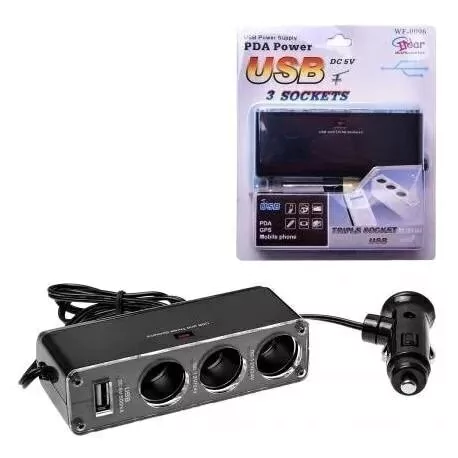 Este adaptador te permite aumentar la cantidad de salidas de 12V de tu auto! Con 3 tomas tipo encendedor 12V y 1 entrada tipo USB de carga tus dispositivos van a estar siempre cargados vayas a donde vayas. Se conecta a tu salida 12V mediante cable y ya tenés cuatro formas de cargar tus equipos.