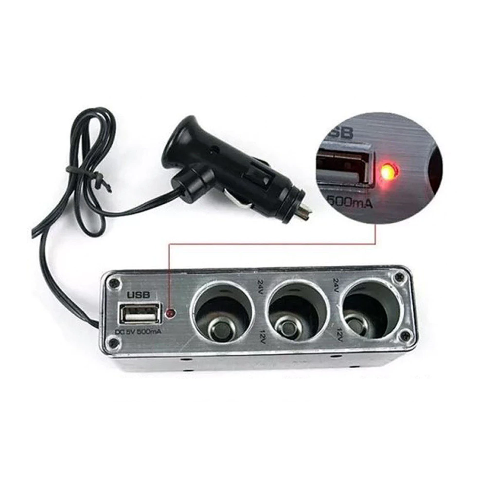 Adaptador multiplicador encendedor de auto | 3 Salidas 12v | 1 Salida USB | 12v-24v | WF-0096