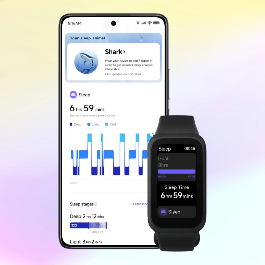 Con la ayuda de tecnologías científicas para el monitoreo del sueño, la pulsera registra tu estado de sueño a toda hora en diferentes etapas, como el sueño profundo, el sueño ligero y el sueño REM, lo que ayuda a mejorar tus hábitos de sueño y la calidad del sueño.