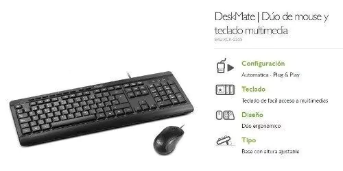 DeskMate | Dúo de mouse y teclado multimedia SKU:KCK-251S ANTSIG • Configuración Automática - Plug & Play • Teclado Teclado de facil acceso a multimedias • Diseño Dúo ergonómico • Tipo Base con altura ajustable La forma original de complementar tu universo digital Complementa tu laptop o PC con este estilizado y moderno dúo de mouse y teclado. Dotado con nueve teclas de activación instantánea, el teclado te permite tener acceso a películas, música, presentaciones de diapositivas, juegos o navegar por el internet con tan sólo pulsar un botón. El diseño ergonómico de las teclas es suave al tacto, el cual ofrece además una digitación más uniforme y precisa que los botones de un dispositivo convencional. El mouse del dúo, equipado con un sensor de alta definición, se desliza con toda suavidad prácticamente sobre cualquier superficie, mientras que su diseño ambidextro permite utilizarlo con toda comodidad en cualquiera de las dos manos. • Mouse y teclado multimedia con configuración automática • Diseño contemporáneo, estilizado y funcional • Teclas de acceso instantáneo a aplicaciones de correo electrónico y de navegación por la web • Las patas traseras permiten inclinar el teclado a la altura adecuada • El mouse ambidiestro ofrece una sujeción cómoda y un desplazamiento fluido del cursor Teclado • Tipo: Teclado de tamaño natural en español con cable • Interfaz: USB • Número de controles: 105 teclas estándar, más 9 botones multimedia • Controles multimedia: Pista anterior, Bajar volumen, Enmudecimiento, Reproducción/Pausa, Detener Subir volumen, Pista siguiente, Página principal y correo electrónico • Indicadores: Bloqueo numérico, de mayúscula y desplazamiento Mouse • Tipo: Mouse 3D de tres botones con cable • Tecnología: Sensor óptico • Resolución CPI: 1000dpi • Interfaz: USB Información adicional • Requisitos del sistema: Familia Windows • Dimensiones del teclado: 44,8x16,9x23,34cm • Longitud del cable: 140cm • Peso del teclado: 575,1g • Dimensiones del mouse: 11,3x6,28x3,82cm • Longitud del cable: 125cm __________________________________________________________________ dotPix Store Rosario • SE ENTREGA EN ROSARIO Y ZONA - (SIN CARGO en zona centro determinados días previa coordinación, o cualquier otro día y zona mediante comisionista a tu cargo) También podés retirar por nuestro local en Arroyo Seco (Desde Rosario por AU9 o por Ruta 21 - Colectivos: M Azul, M Verde, Línea A (x Ruta 21). • ADEMÁS: ¡ENVÍOS A TODO EL PAÍS POR MERCADOENVÍOS! • Consultá costo en esta misma publicación colocando tu código postal y el tipo de envío. • Más de 5 años vendiendo en el sitio con excelentes calificaciones • Consultá stock/color disponible previamente a comprar • Consultanos, sacate todas tus dudas y te responderemos lo antes posible. ¡Tu pregunta no molesta!