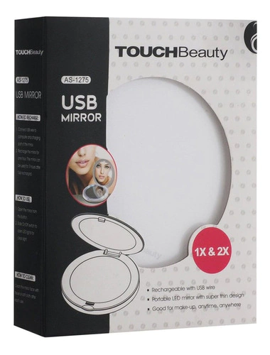 CARACTERÍSTICAS • Espejo doble de cartera. • Posee un espejo de aumento 2x y otro 1x. • 4 Luces led integradas para mejor utilización. • Recargable con USB. • Color: Blanco perla.