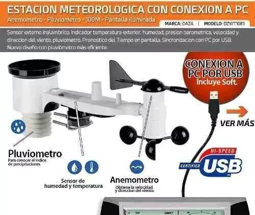 Estación Meteorológica DAZA DZ-WT1081 Estación meteorológica digital con conexión a PC vía USB. Pantalla táctil retroiluminada. Sensor exterior inalámbrico. Representación de temperatura interior y exterior, dirección y velocidad del viento, barómetro, pluviómetro, pronósticos y alertas.