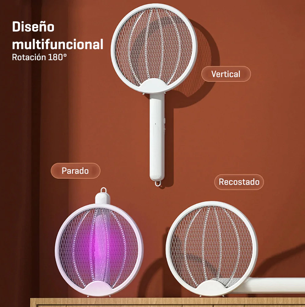 Funciona como raqueta eléctrica y como trampa inteligente para mosquitos. Su base permite múltiples posiciones: plegada, manual, vertical o montada en la pared. Incluye dos modos de uso: trampa luminosa y eliminación directa.