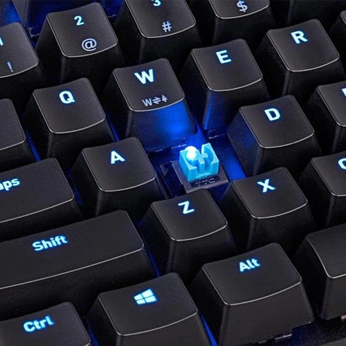 • INTERRUPTORES MECÁNICOS A PRUEBA DE POLVO TTC Los interruptores mecánicos azules TTC están diseñados para juego y construidos para ofrecer una velocidad y precisión superiores para una máxima capacidad de respuesta. El interruptor azul clásico proporciona un golpe táctil con un clic audible para los jugadores que desean sentir y escuchar cada pulsación de tecla. Los interruptores TTC están diseñados para gran durabilidad y proveen una vida útil de 50 millones de pulsaciones de teclas.